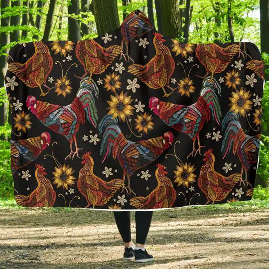 Chickens with Flowers Embroidery Pattern Hooded Blanket