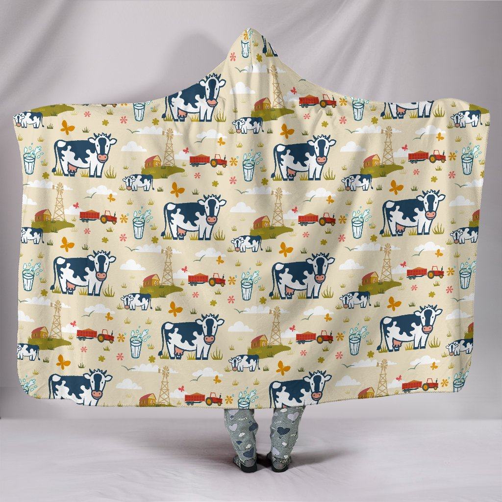 Farm Life with Dairy Cow, Tractor and Pasture Hooded Blanket