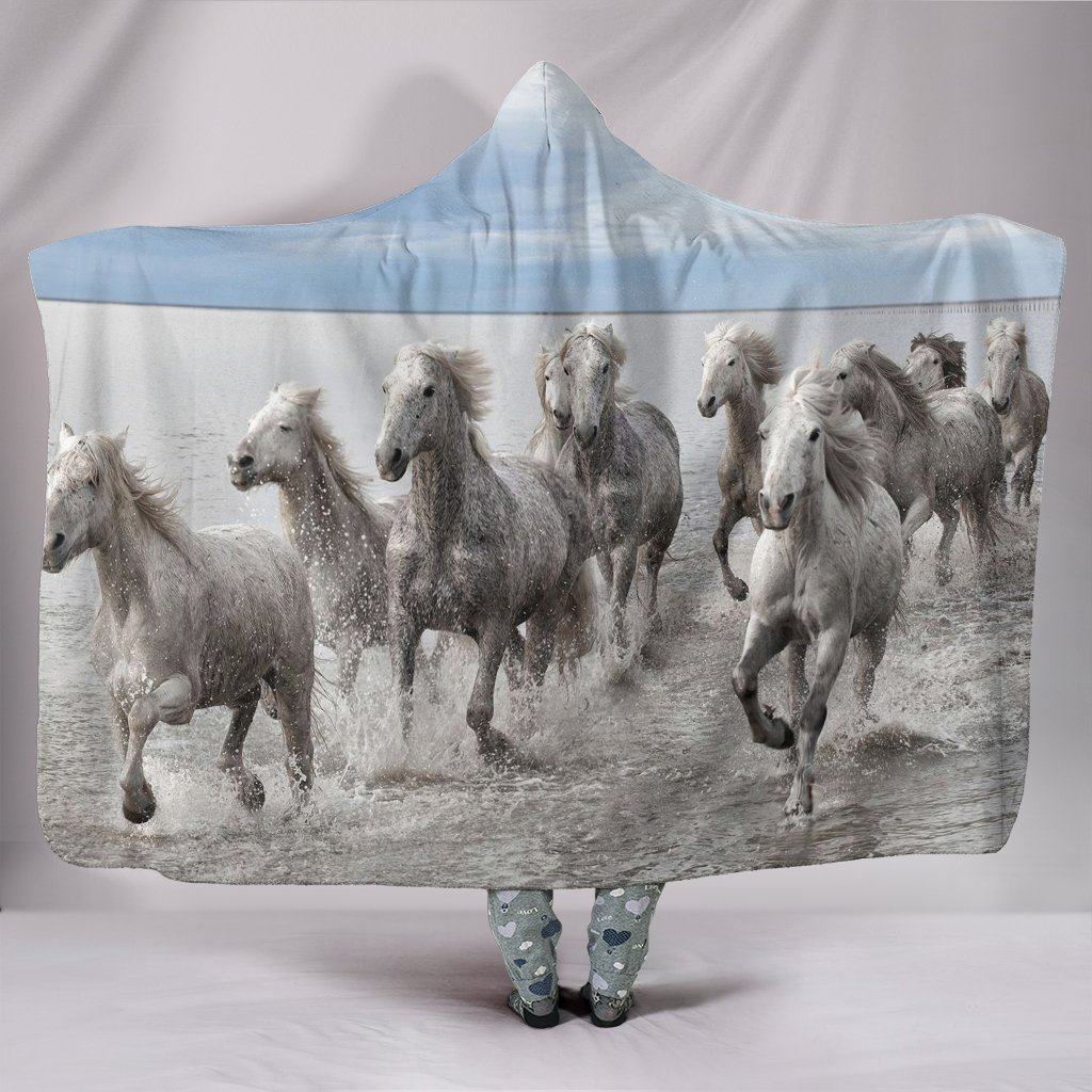 Group of White Horse Running Hooded Blanket
